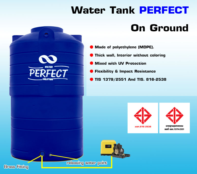 3. Assemble the pipe from the water supply meter into the water inlet of the Perfecct water tank and assemble the water outlet with the water pipe or connect to the automatic pump and then test the leak at the joints. By using water valve or automatic water pump switch To operate normally while closing the valve And sanitary ware at every point If it is found that the water level has decreased Or the pump works frequently Shows that the pipes inside the building are leaking. Repair the pipe again until it works well.